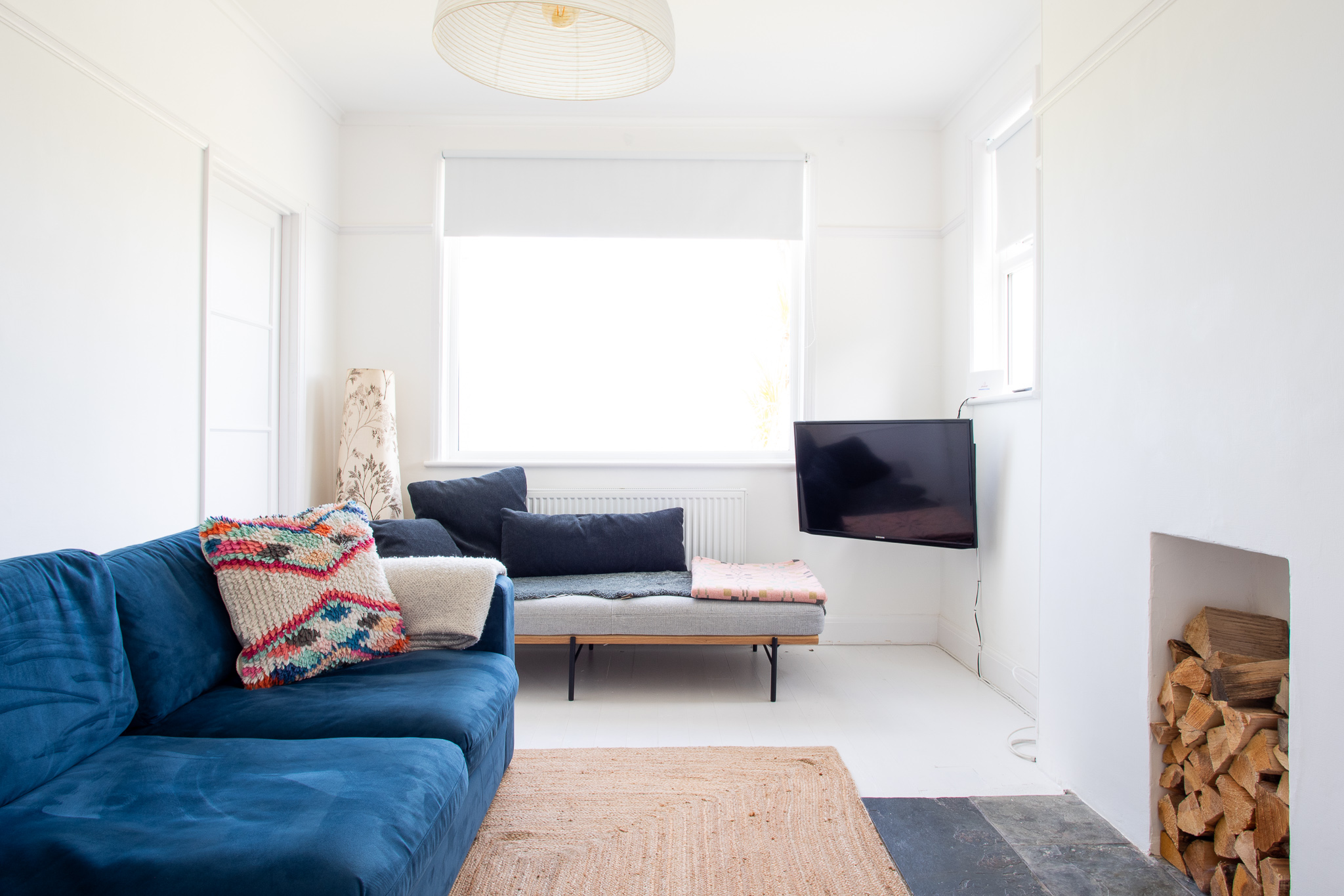 The front living room with its lime washed exposed granite walls has cosy seating for 4. With TV, wood burning stove this makes for a restful space after a busy day exploring Newlyn and beyond, with its cosy window seat and sash windows.